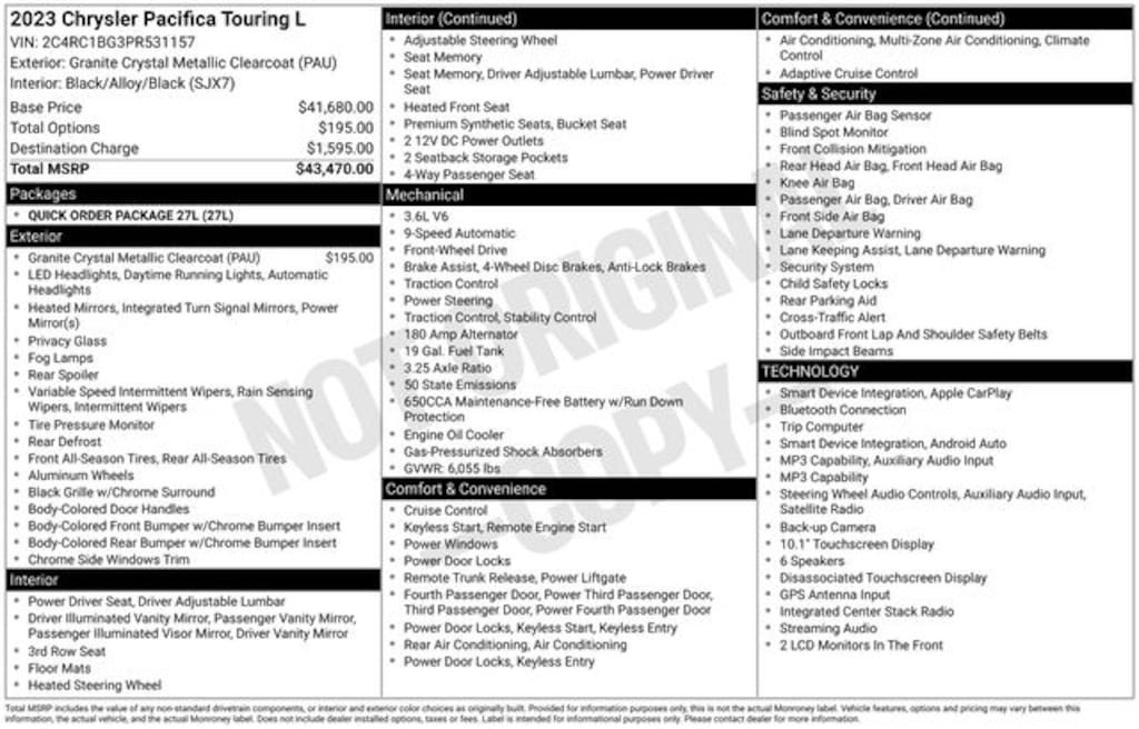 Granite Crystal Metallic Clearcoat 2023 Chrysler Pacifica Touring L 4D Passenger Van FWD 9-Speed 948TE Automatic 3.6L V6 24V VVT