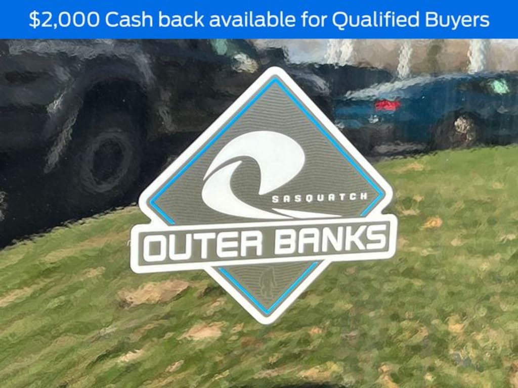 110V/400W AC Power Outlet, 2nd Row Carpeted Seatback, 360-Degree Camera w/Trail & Split View, 4-Wheel Disc Brakes, 6 Speakers, ABS brakes, Air Conditioning, Alloy wheels, AM/FM radio: SiriusXM, AM/FM Stereo, Auto High-beam Headlights, Auto-dimming Rear-View mirror, Automatic temperature control, Auxiliary Switches & Wiring, B&O Sound System by Bang & Olufsen, Brake assist, Brush Guard, Cargo Management System (Shelf/Divider/Table), Class II Trailer Tow Pack w/Trailer Sway Control, Compass, Connected Navigation, Delay-off headlights, Driver door bin, Driver vanity mirror, Dual front impact airbags, Dual front side impact airbags, Electronic Stability Control, Emergency communication system: SYNC 4 911 Assist, Equipment Group 300A, Fender Tie Downs, Four wheel independent suspension, Front & Rear Black Bumpers, Front & Rear Floor Liners w/o Carpet Mats, Front anti-roll bar, Front Bucket Seats, Front Center Armrest, Front Driver/Passenger Seat Back Map Pockets, Front dual zone A/C, Front fog lights, Front Parking Sensors, Front reading lights, Fully automatic headlights, Garage door transmitter, HD Radio, Heated door mirrors, Heated front seats, Heated steering wheel, High Clearance Fender Flares, HOSS 2.0 Off-Road Suspension, Illuminated entry, Interior Grab Handle, Knee airbag, Low tire pressure warning, Memory seat, Occupant sensing airbag, Outer Banks Tech Package+, Outside temperature display, Overhead airbag, Overhead console, Panic alarm, Passenger door bin, Passenger vanity mirror, Power door mirrors, Power driver seat, Power Moonroof, Power passenger seat, Power steering, Power windows, Premium Trimmed Front Bucket Seats w/Ebony/Roast, Radio data system, Rain sensing wipers, Rear anti-roll bar, Rear Parking Sensors, Rear reading lights, Rear seat center armrest, Rear window defroster, Rear window wiper, Recovery Hooks, Remote keyless entry, Reverse Brake Assist, Sasquatch Outer Banks Package, Security system, SiriusXM, Speed control, Speed-sensing steering, Speed-Sensitive Wipers, Split folding rear seat, Steering wheel mounted audio controls, SYNC 4 w/Enhanced Voice Recognition, Tachometer, Telescoping steering wheel, Tilt steering wheel, Traction control, Trail Control for Off-Road, Trip computer, Variably intermittent wipers, Wheels: 17" Ebony Black-Painted Aluminum, Wheels: 18" Ebony Black-Painted Aluminum.