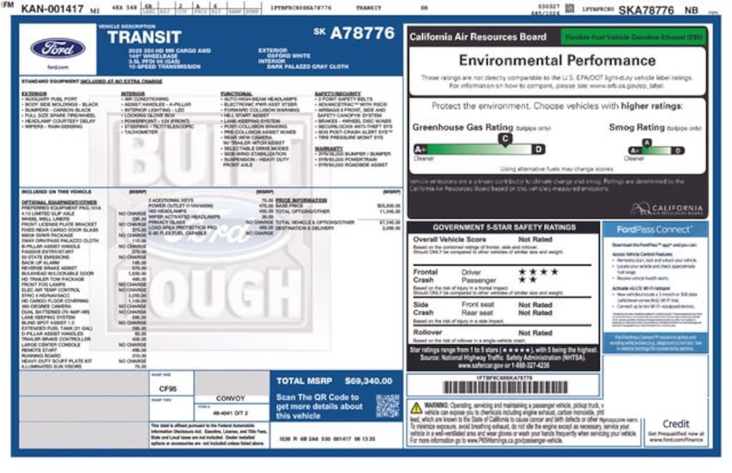 110V/400W Power Outlet, 2 Additional Keys (4 Total), 360-Degree Camera w/Split View, 4 Speakers, 4-Wheel Disc Brakes, 4.10 Limited-Slip Axle Ratio, ABS brakes, Air Conditioning, AM/FM radio, AM/FM Stereo, Auto High-beam Headlights, Back Up Alarm, BLIS Blind Spot Information System, Brake assist, Chrome High-Intensity Discharge (HID) Headlamps, D-Pillar Assist Handles, Dark Palazzo Gray Cloth Bucket Seats w/Armrests, Dark Palazzo Gray Vinyl Bucket Seats, Delay-off headlights, Driver door bin, Driver's Seat Mounted Armrest, Dual AGM Batteries (70 Amp-hr Each), Dual front impact airbags, Dual front side impact airbags, Electronic Air Temperature Control, Electronic Stability Control, Exterior Parking Camera Rear, Fixed Rear Cargo Door Glass, Frame Mounted Hitch Receiver, Front & Rear Vinyl Floor Covering, Front anti-roll bar, Front Black Wheel Well Liners, Front Bucket Seats, Front Fog Lamps, Front License Plate Bracket, Front reading lights, Front Sensing System, Front wheel independent suspension, Fully automatic headlights, Heavy-Duty Cargo Flooring, Heavy-Duty Scuff Plate Kit, Heavy-Duty Trailer Tow Package, Honeycomb Mesh Grille w/Chrome Surround, Illuminated entry, Illuminated Sun Visors, Intelligent Access w/Push-Button Start, Intelligent Adaptive Cruise Control, Intelligent Speed Assist (ISA), Intersection Assist, Lane Keeping System, Large Center Console, Load Area Protection Package, Lockable Door Bulkhead w/Window, Low tire pressure warning, Midship Extended Range Fuel Tank (31 Gallons), Occupant sensing airbag, Order Code 101A, Overhead airbag, Panic alarm, Passenger cancellable airbag, Passenger door bin, Passenger Running Boards, Passenger-Side B-Pillar Assist Handle, Power door mirrors, Power steering, Power windows, Privacy Glass, Radio: AM/FM Stereo w/SYNC 4/SiriusXM w/360L/Nav/iACC, Rear-Window Defroster, Rearview Mirror, Remote keyless entry, Remote Start, Reverse Brake Assist, Reverse Sensing System, Short-Arm Manual-Folding Power Adjust Mirrors, Short-Arm Pwr-Folding Heated Pwr Adjusting Mirrors, Speed control, Steering wheel mounted audio controls, Tachometer, Telescoping steering wheel, Tilt steering wheel, Tow/Haul Mode w/Trailering Wiring Provisions, Traction control, Traffic Sign Recognition (TSR), Trailer Brake Controller (TBC), Variably intermittent wipers, Vinyl Front Bucket Seats, Wheels: 16" Silver Steel w/Silver Hubcaps, Wiper Activated Headlamps.