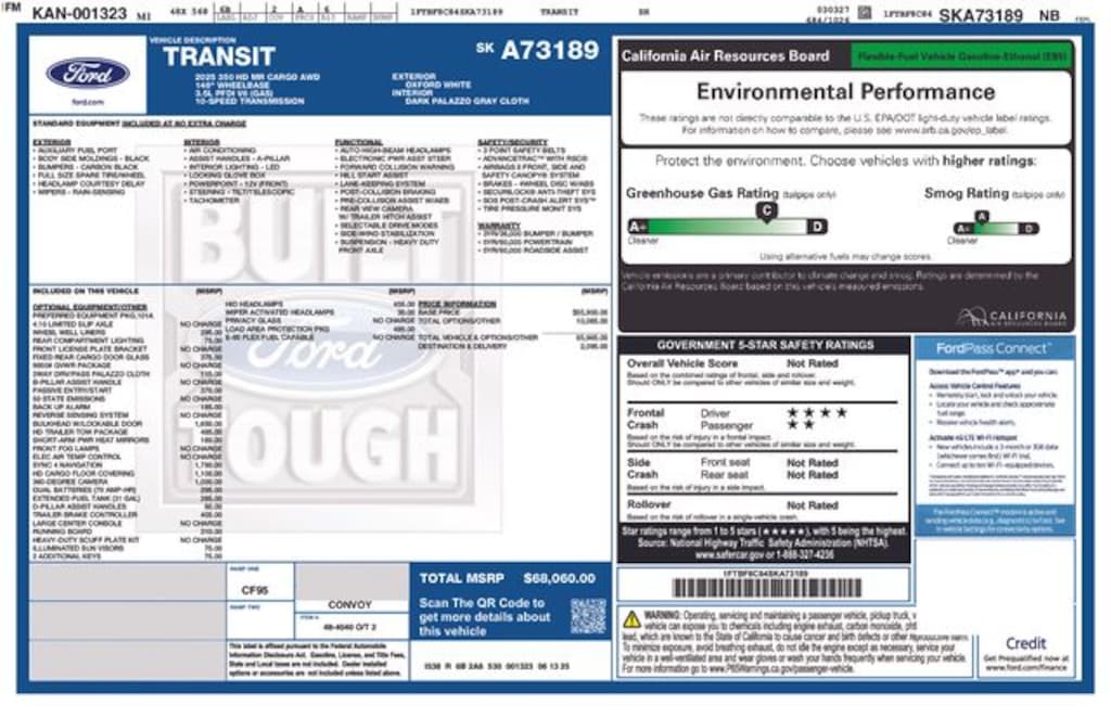 2 Additional Keys (4 Total), 360-Degree Camera w/Split View, 4 Speakers, 4-Wheel Disc Brakes, 4.10 Limited-Slip Axle Ratio, ABS brakes, Air Conditioning, AM/FM radio, AM/FM Stereo, Auto High-beam Headlights, Back Up Alarm, Brake assist, Chrome High-Intensity Discharge (HID) Headlamps, D-Pillar Assist Handles, Dark Palazzo Gray Cloth Bucket Seats w/Armrests, Dark Palazzo Gray Vinyl Bucket Seats, Delay-off headlights, Driver door bin, Driver's Seat Mounted Armrest, Dual AGM Batteries (70 Amp-hr Each), Dual front impact airbags, Dual front side impact airbags, Electronic Air Temperature Control, Electronic Stability Control, Exterior Parking Camera Rear, Fixed Rear Cargo Door Glass, Frame Mounted Hitch Receiver, Front & Rear Vinyl Floor Covering, Front anti-roll bar, Front Black Wheel Well Liners, Front Bucket Seats, Front Fog Lamps, Front License Plate Bracket, Front reading lights, Front wheel independent suspension, Full Rear Compartment Lighting, Fully automatic headlights, Heavy-Duty Cargo Flooring, Heavy-Duty Scuff Plate Kit, Heavy-Duty Trailer Tow Package, Honeycomb Mesh Grille w/Chrome Surround, Illuminated entry, Illuminated Sun Visors, Intelligent Access w/Push-Button Start, Intelligent Speed Assist (ISA), Large Center Console, Load Area Protection Package, Lockable Door Bulkhead w/Window, Low tire pressure warning, Midship Extended Range Fuel Tank (31 Gallons), Occupant sensing airbag, Order Code 101A, Overhead airbag, Panic alarm, Passenger cancellable airbag, Passenger door bin, Passenger Running Boards, Passenger-Side B-Pillar Assist Handle, Power door mirrors, Power steering, Power windows, Privacy Glass, Radio: AM/FM Stereo w/SYNC 4/SiriusXM w/360L/Nav, Rear-Window Defroster, Rearview Mirror, Remote keyless entry, Reverse Sensing System, Short-Arm Manual-Folding Heated Pwr Adjusting Mirrors, Short-Arm Manual-Folding Power Adjust Mirrors, Speed control, Steering wheel mounted audio controls, Tachometer, Telescoping steering wheel, Tilt steering wheel, Tow/Haul Mode w/Trailering Wiring Provisions, Traction control, Traffic Sign Recognition (TSR), Trailer Brake Controller (TBC), Variably intermittent wipers, Vinyl Front Bucket Seats, Wheels: 16" Silver Steel w/Silver Hubcaps, Wiper Activated Headlamps.