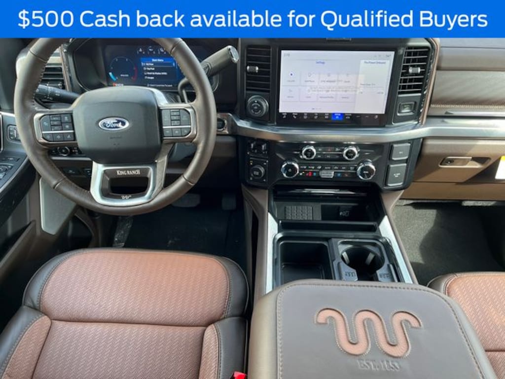 4WD, 14 Speakers, 4-Wheel Disc Brakes, 5th Wheel/Gooseneck Hitch Prep Package, ABS brakes, Adjustable pedals, Air Conditioning, All-Weather Floor Mats, Alloy wheels, AM/FM radio: SiriusXM with 360L, Auto High-beam Headlights, Auto tilt-away steering wheel, Auto-dimming Rear-View mirror, Automatic temperature control, Brake assist, Chrome Package, Compass, Delay-off headlights, Driver door bin, Driver vanity mirror, Dual front impact airbags, Dual front side impact airbags, Electronic Stability Control, Emergency communication system: SYNC 4 911 Assist, Engine Block Heater, Flow-Through Console, Ford Connectivity Package (1-Year Included), Ford Connectivity Package (one-Time Purchase - 7 Years), Front and Rear Wheel Well Liners, Front anti-roll bar, Front Bucket Seats, Front Center Armrest, Front dual zone A/C, Front fog lights, Front reading lights, Front Splash Guards/Mud Flaps, Fully automatic headlights, FX4 Off-Road Package, Garage door transmitter, Gooseneck Hitch Kit, Heads-Up Display, Heated door mirrors, Heated front seats, Heated rear seats, Heated steering wheel, Hill Descent Control, Illuminated entry, Internet access capable: 5G Modem - Ford Connectivity Package, Leather steering wheel, LED Roof Clearance Lights, Low tire pressure warning, Max Recline Seats, Memory seat, Navigation system: Connected Navigation, Off-Road Specifically Tuned Shock Absorbers, Onboard Scales and Smart Hitch, Order Code 710A, Outside temperature display, Overhead airbag, Overhead console, Panic alarm, Passenger door bin, Passenger vanity mirror, Pedal memory, Power door mirrors, Power driver seat, Power passenger seat, Power steering, Power windows, Pro Power Onboard - 2kW, Radio: B&O Unleashed Sound System by Bang & Olufsen, Rain sensing wipers, Rear reading lights, Rear seat center armrest, Rear Splash Guards/Mud Flaps, Rear step bumper, Rear window defroster, Remote keyless entry, Retractable Tonneau Pickup Box Cover, SecuriCode Keyless Entry Keypad (driver's Side), Security system, SiriusXM with 360L, SiriusXM with 360L (3-Year Plan), Snow Plow Prep Package, Speed control, Split folding rear seat, Steering wheel memory, Steering wheel mounted A/C controls, Steering wheel mounted audio controls, SYNC 4 with Enhanced Voice Recognition, Tachometer, Telescoping steering wheel, Tilt steering wheel, Tough Bed Spray-in Bedliner, Traction control, Trip computer, Turn signal indicator mirrors, Twin Panel Power Moonroof, Unique FX4 Off-Road Box Decal, Unique King Ranch Leather 40/Console/40 Seats, Upfitter Switches (6), Variably intermittent wipers, Vehicle Integration System 2.0, Ventilated front seats, Wheels: 20" Bright Machined Aluminum, LED Light Bar, 4WD.