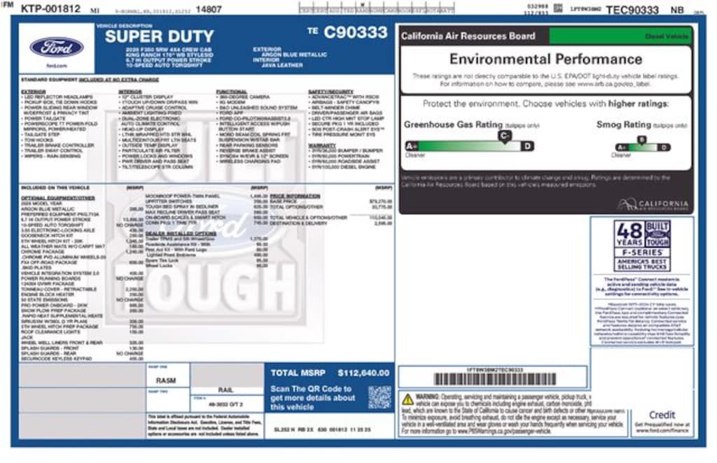 Dealer Disclosure: New Car Prices are based off of Ford Employee A/Z Plan price. Sales Tax, Title, License Fee, Registration Fee, Dealer Documentary Fee ($280), Finance Charges and Emission Testing Fees (if applicable) are additional to the advertised price. See Dealer for Details. Price includes: $500 - 2026 Military Recognition Exclusive Cash Reward. Exp. 01/04/2027 Price includes dealer added accessories.