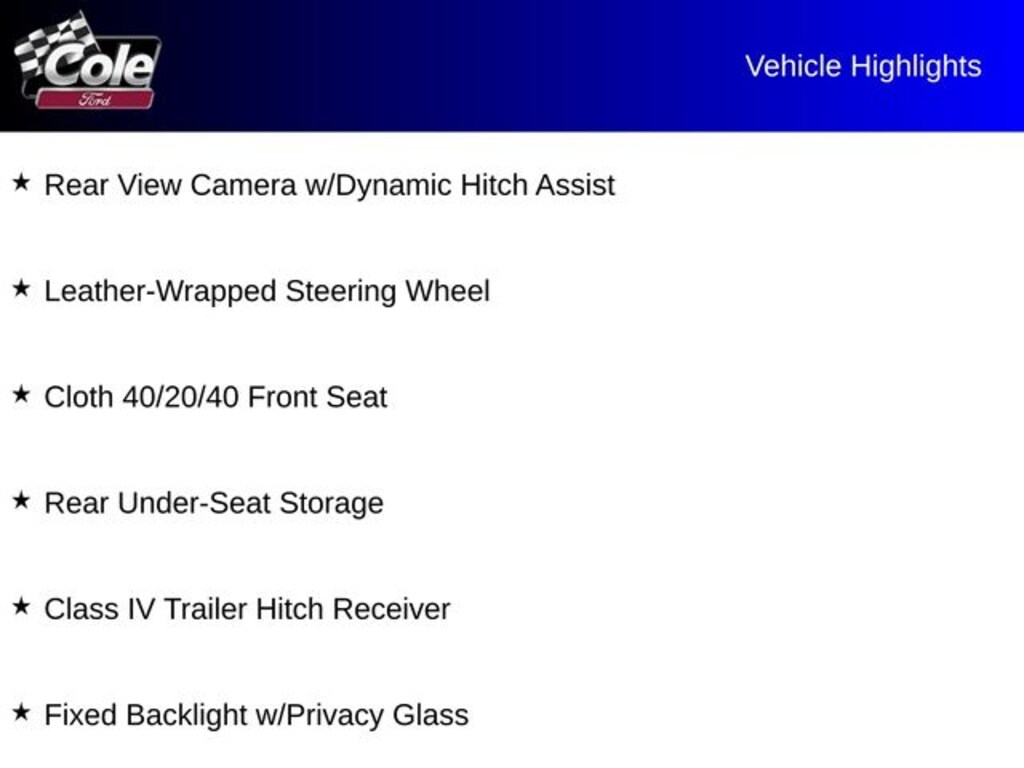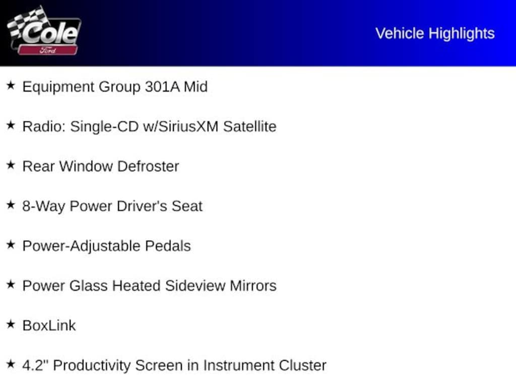 4WD, 4.2" Productivity Screen in Instrument Cluster, 8-Way Power Driver's Seat, BoxLink, Class IV Trailer Hitch Receiver, Cloth 40/20/40 Front Seat, Equipment Group 301A Mid, Fixed Backlight w/Privacy Glass, Leather-Wrapped Steering Wheel, Power Glass Heated Sideview Mirrors, Power-Adjustable Pedals, Radio: Single-CD w/SiriusXM Satellite, Rear Under-Seat Storage, Rear View Camera w/Dynamic Hitch Assist, Rear Window Defroster, 3.31 Axle Ratio, 4-Wheel Disc Brakes, ABS brakes, Air Conditioning, Brake assist, Compass, Delay-off headlights, Driver door bin, Dual front impact airbags, Dual front side impact airbags, Electronic Stability Control, Front anti-roll bar, Front wheel independent suspension, Fully automatic headlights, Integrated Trailer Brake Controller, Low tire pressure warning, Occupant sensing airbag, Outside temperature display, Overhead airbag, Passenger door bin, Passenger vanity mirror, Power steering, Rear step bumper, Speed-sensing steering, Split folding rear seat, SYNC 3, Tachometer, Telescoping steering wheel, Tilt steering wheel, Traction control, Variably intermittent wipers, Voltmeter, 4WD, 4.2" Productivity Screen in Instrument Cluster, 8-Way Power Driver's Seat, BoxLink, Class IV Trailer Hitch Receiver, Cloth 40/20/40 Front Seat, Equipment Group 301A Mid, Fixed Backlight w/Privacy Glass, Leather-Wrapped Steering Wheel, Power Glass Heated Sideview Mirrors, Power-Adjustable Pedals, Radio: Single-CD w/SiriusXM Satellite, Rear Under-Seat Storage, Rear View Camera w/Dynamic Hitch Assist, Rear Window Defroster.