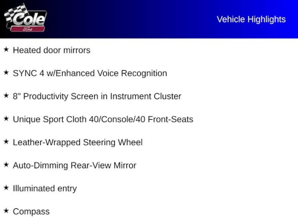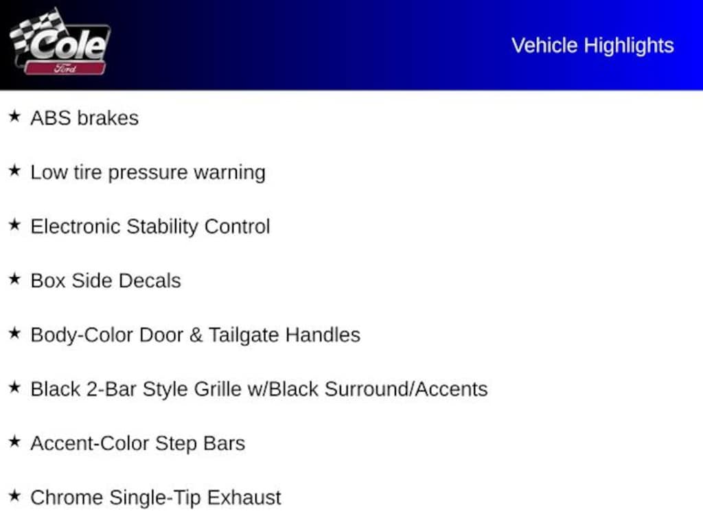 4WD, 8-Way Power Driver's Seat w/Power Lumbar, 8" Productivity Screen in Instrument Cluster, ABS brakes, Accent-Color Step Bars, Alloy wheels, Auto-Dimming Rear-View Mirror, Black 2-Bar Style Grille w/Black Surround/Accents, Body-Color Door & Tailgate Handles, Body-Color Front & Rear Bumpers, Box Side Decals, Chrome Single-Tip Exhaust, Class IV Trailer Hitch Receiver, Compass, Dual Zone Electronic Automatic Temperature Control, Electronic Stability Control, Equipment Group 301A Mid, GVWR: 6,470 lbs Payload Package, Heated door mirrors, Illuminated entry, Leather-Wrapped Steering Wheel, Low tire pressure warning, Rear Under-Seat Storage, Remote keyless entry, SecuriCode Drivers Side Keyless-Entry Keypad, SYNC 4 w/Enhanced Voice Recognition, Traction control, Unique Sport Cloth 40/Console/40 Front-Seats, Wheels: 18" 6-Spoke Machined Aluminum, XLT Sport Appearance Package.