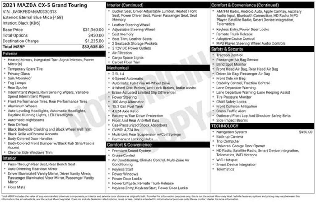 10 Speakers, Alloy wheels, Power Liftgate, Power moonroof, 4-Wheel Disc Brakes, 4.624 Axle Ratio, ABS brakes, Air Conditioning, AM/FM radio: SiriusXM, AppLink/Apple CarPlay and Android Auto, Auto High-beam Headlights, Auto-dimming Rear-View mirror, Automatic temperature control, Bose 10-Speaker Premium Audio Sound System, Brake assist, Bumpers: body-color, Delay-off headlights, Driver door bin, Driver vanity mirror, Dual front impact airbags, Dual front side impact airbags, Electronic Stability Control, Emergency communication system: MAZDA CONNECT, Exterior Parking Camera Rear, Four wheel independent suspension, Front anti-roll bar, Front Bucket Seats, Front Center Armrest, Front dual zone A/C, Front fog lights, Front reading lights, Fully automatic headlights, Garage door transmitter: HomeLink, Heated door mirrors, Heated Front Bucket Seats, Heated front seats, Illuminated entry, Leather Seat Trim, Leather Shift Knob, Low tire pressure warning, Memory seat, Occupant sensing airbag, Outside temperature display, Overhead airbag, Overhead console, Panic alarm, Passenger door bin, Passenger vanity mirror, Power door mirrors, Power driver seat, Power passenger seat, Power steering, Power windows, Radio data system, Radio: AM/FM/HD Audio System, Rain sensing wipers, Rear anti-roll bar, Rear reading lights, Rear seat center armrest, Rear window defroster, Rear window wiper, Remote keyless entry, Speed control, Speed-sensing steering, Split folding rear seat, Spoiler, Steering wheel mounted audio controls, Tachometer, Telescoping steering wheel, Tilt steering wheel, Traction control, Trip computer, Turn signal indicator mirrors, Variably intermittent wipers, Wheels: 19" x 7J Aluminum Alloy, 10 Speakers, Alloy wheels, Power Liftgate, Power moonroof.